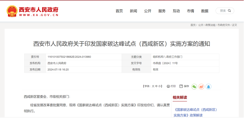 7月19日,西安市人民政府面向西咸新區管委會,市級相關部門印發《國家碳達峰試點(西咸新區)實施方案》,聚焦綠色低碳發展的能源和產業轉型瓶頸制約,加快提升能源清潔化利用效率、基礎設施綠色低碳化水平和減污降碳協同能力,全面推動產業高質量發展和資源循環利用。