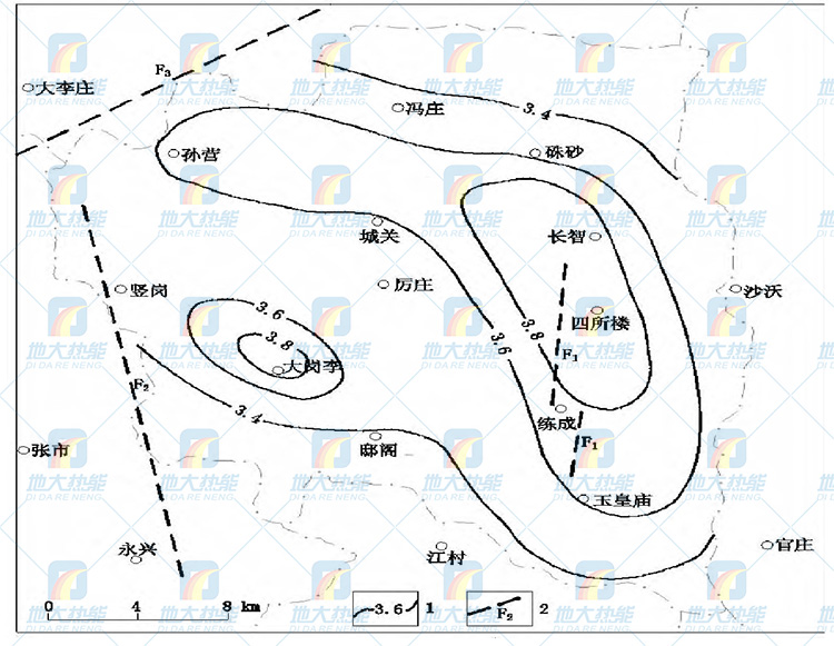 根據(jù)地溫梯度計(jì)算, 500 m埋深地溫變化范圍32~35℃, 1000 m埋深地溫變化范圍48~54℃。500 m埋深大于34℃的高溫區(qū)及1000 m埋深大于52℃的高溫區(qū)主要分布在長(zhǎng)智-四所樓-練成-玉皇廟及大崗李一帶。地溫垂向上隨地層深度增加而增大, 300~500m深度為25~35℃;500~700 m深度為31~40℃;700~1000 m深度為40~53℃;推算1400 m深度地溫達(dá)60℃左右。
