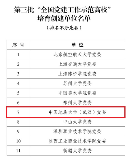 近日,教育部下發(fā)了《教育部辦公廳關(guān)于公布第三批全國(guó)黨建工作示范高校、標(biāo)桿院系、樣板支部培育創(chuàng)建單位名單的通知》,公布了第三批新時(shí)代高校黨建示范創(chuàng)建和質(zhì)量創(chuàng)優(yōu)工作評(píng)審結(jié)果,遴選產(chǎn)生了11個(gè)全國(guó)黨建工作示范高校、100個(gè)全國(guó)黨建工作標(biāo)桿院系、1000個(gè)全國(guó)黨建工作樣板支部。中國(guó)地質(zhì)大學(xué)(武漢)黨委入選“全國(guó)黨建工作示范高校”培育創(chuàng)建單位,環(huán)境學(xué)院“張國(guó)旗班”黨支部、工程學(xué)院勘察與基礎(chǔ)工程系黨支部入選“全國(guó)黨建工作樣板支部”培育創(chuàng)建單位。