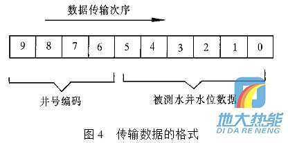 現(xiàn)在通過單片機(jī)輸出控制一組由三極管組成的電子開關(guān),由電子開關(guān)代替按鍵功能完成數(shù)據(jù)輸入.例如:要傳輸十進(jìn)制數(shù)據(jù)0,1,2,3,4,5,6,7,8,9,單片機(jī)依次輸出接通雙音頻編碼器輸入數(shù)字按鍵0,1,2,3,4,5,6,7,8,9對圖4 傳輸數(shù)據(jù)的格式應(yīng)的電子開關(guān)的控制信號,則該組數(shù)據(jù)經(jīng)雙音多頻編碼器轉(zhuǎn)換為雙音頻信號. 雙音多頻編碼器在單片機(jī)控制下,定時“撥通”水位監(jiān)測中心電話號碼,在水位監(jiān)測中心計算機(jī)應(yīng)答并“摘機(jī)”的情況下,通過這條已接通的電話線路,將所測的水位數(shù)據(jù),經(jīng) 過雙音多頻編碼器編碼后傳送到監(jiān)控中心. 要傳輸?shù)臄?shù)據(jù)格式為:數(shù)據(jù)長度為10位十進(jìn)制數(shù),其中高四位為井號編碼,低六位為所測量的水井水位數(shù)據(jù),水位數(shù)據(jù)分整數(shù)和小數(shù)兩部分.數(shù)據(jù)傳輸?shù)姆较蚴菑母呶坏降孜?數(shù)據(jù)格式如圖4所示.