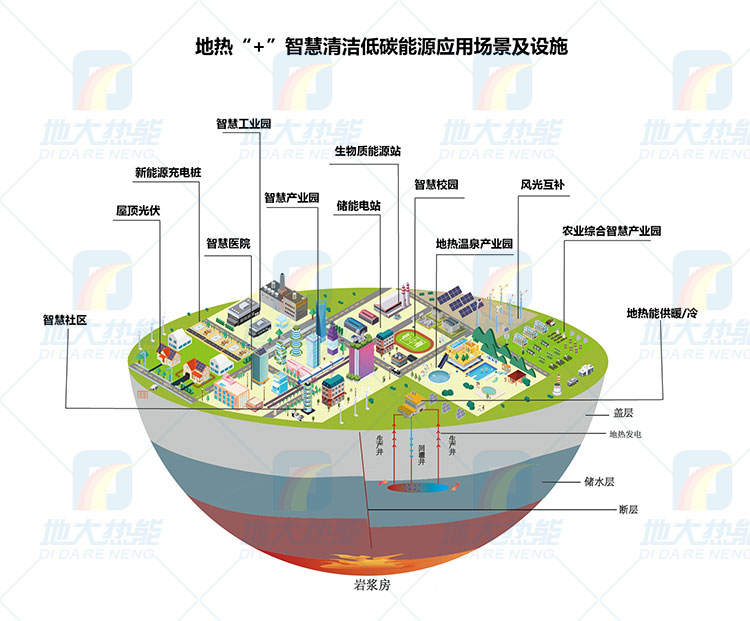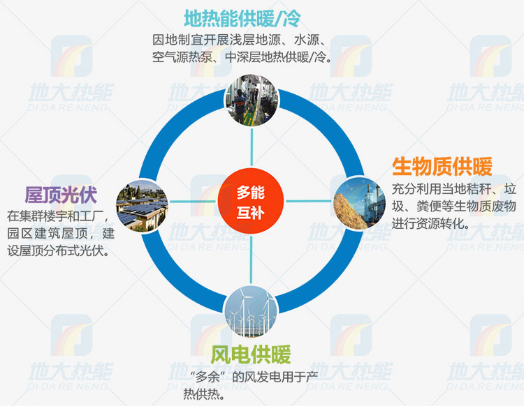 地熱+(風能、太陽能、氫能、儲能、水能、生物質能等)新能源,根據因地制宜、多能互補實現能源綜合開發利用。